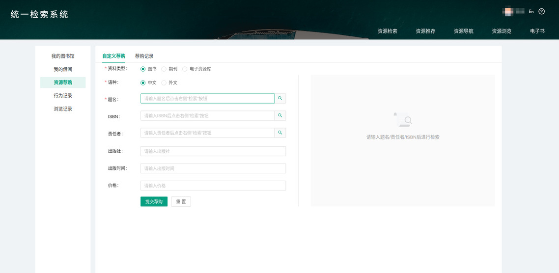 为不断提高纸本图书采购质量、满足师生对文献信息的需求,图书馆特面向全校师生开通资源荐购服务。