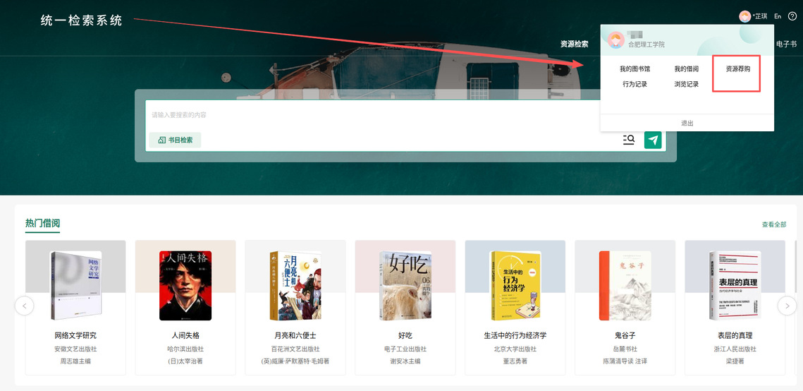 1、书目检索系统荐购:登录统一检索系统(https://findhfit.libsp.cn)→点击右上角个人头像登录→进入资源荐购界面。